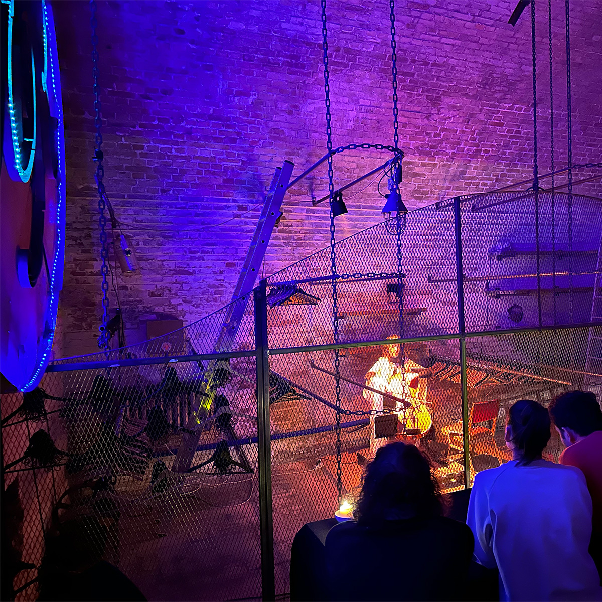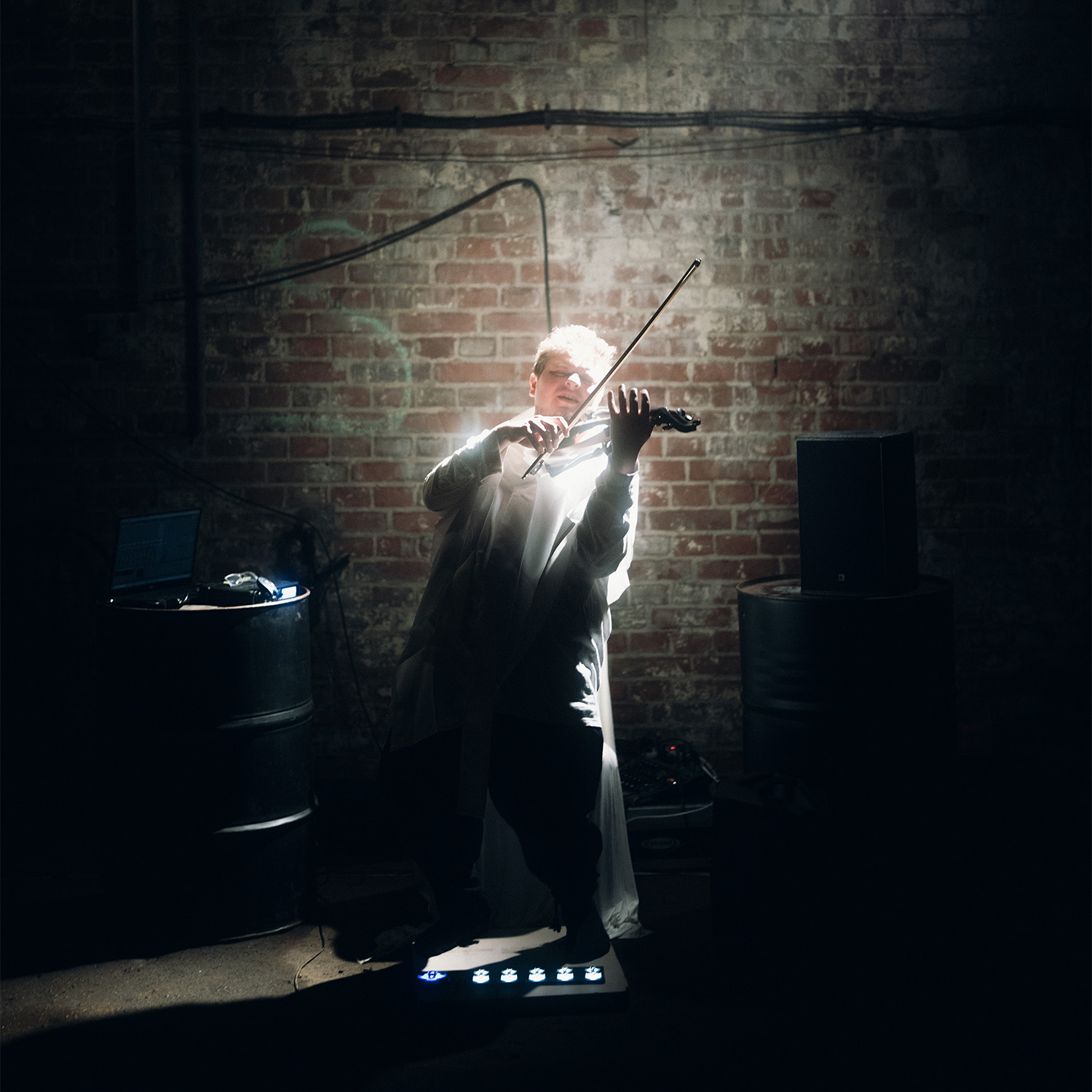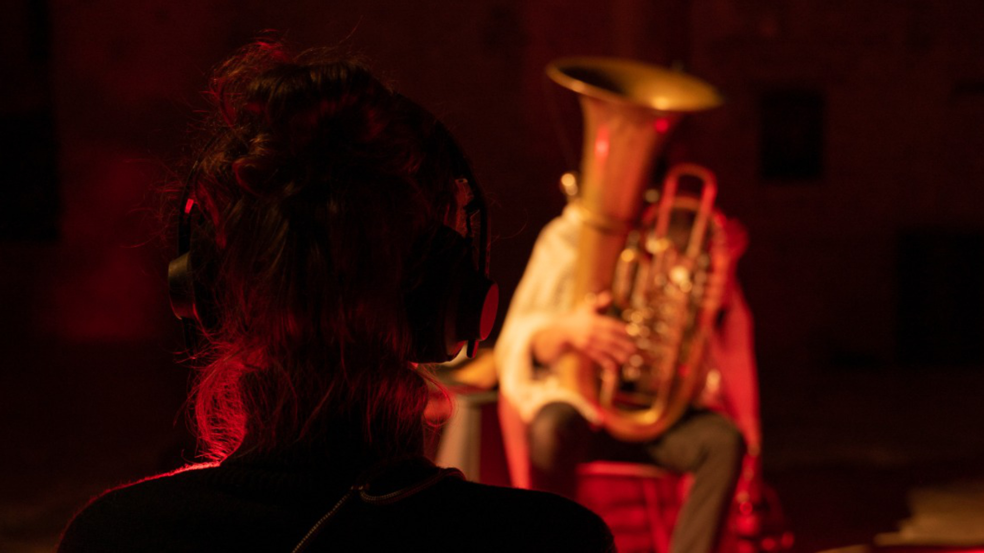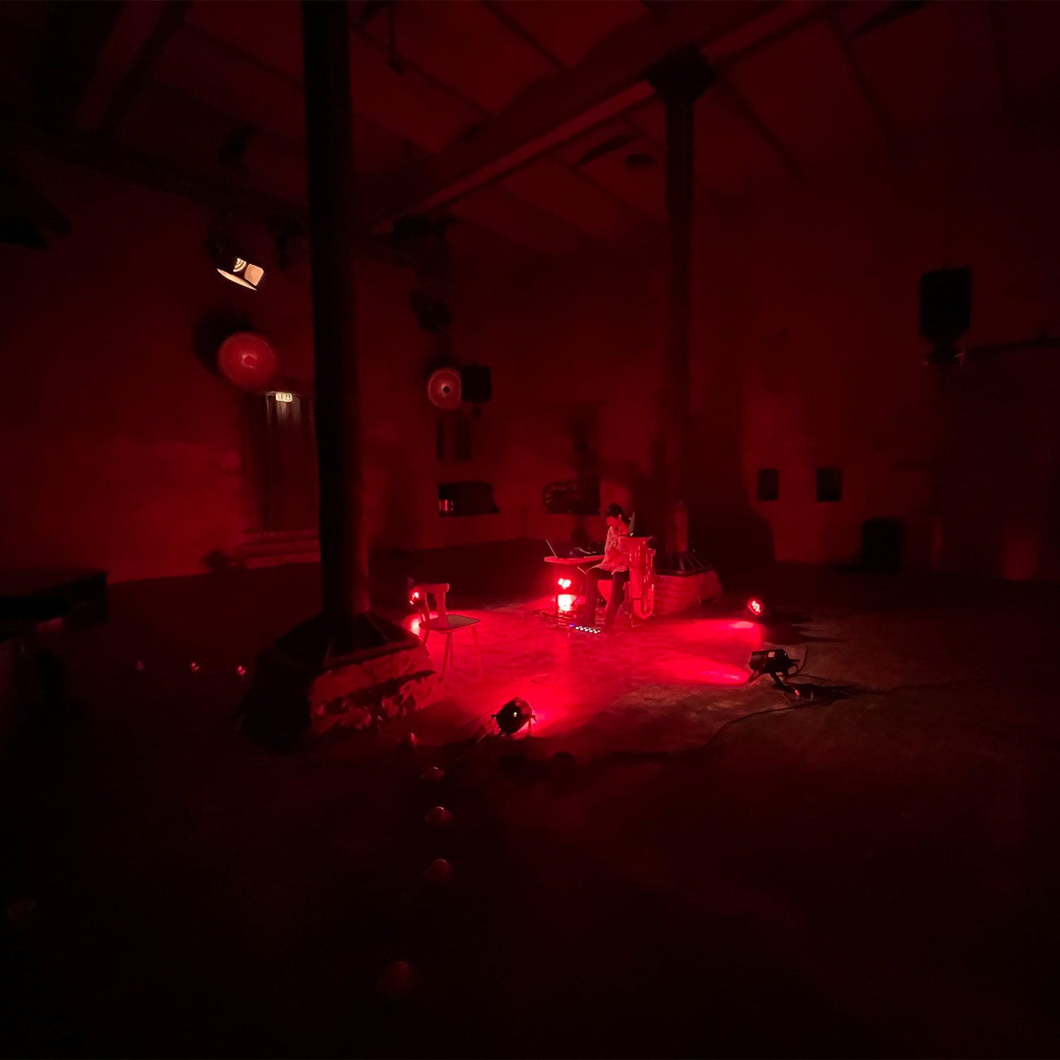 In der düsteren Keller-Finsternis wurde das 1:1 SETTING im großen ehemaligen Brauerei-Gewölbe - dem BALLROOM - zur glühend roten Herzkammer des Labyrinthes. Als Überraschungsmusiker spielte der Klangzauberer und Tubist Jonas Urbat, der mit den warmen und tiefen Klängen seines Instrumentes die Gäste auf ganz besonders intime Weise in den Bann seiner Kunst zog. Jonas lud die Hörer:innen über spezielle Kopfhörer noch vor dem 1:1 Blickkontakt in einen gemeinsamen Audio-Klangraum ein und spielte eine ganz nach Blickkontakt und Gast individuell gestaltete Version seines Stückes „Reise”. Gepaart mit Loops und Soundeffekten, die über die am Instrument befestigten Mikrofone live erzeugt wurden, hatte man hier die Chance, die Tuba mit Jonas in all seinen Facetten zu erleben.