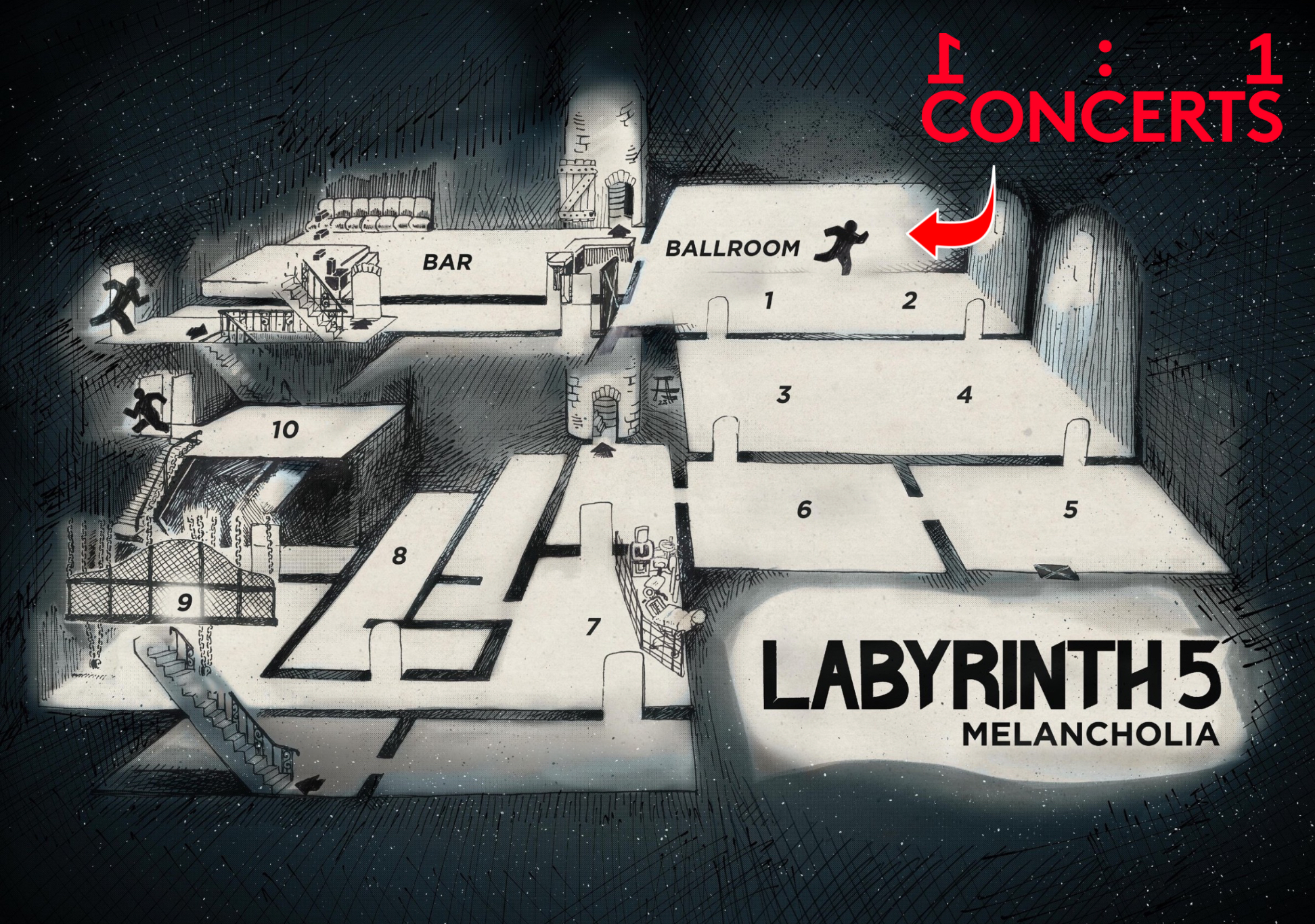 Lageplan des verschlungenen Labyrinths, die 1:1 CONCERTS fanden im BALLROOM statt.