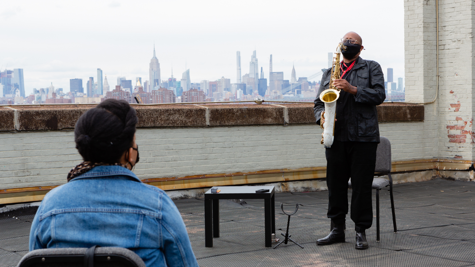 Saxophonist Danny Mekonnen spielt auf dem Dach des Building 280, Brooklyn