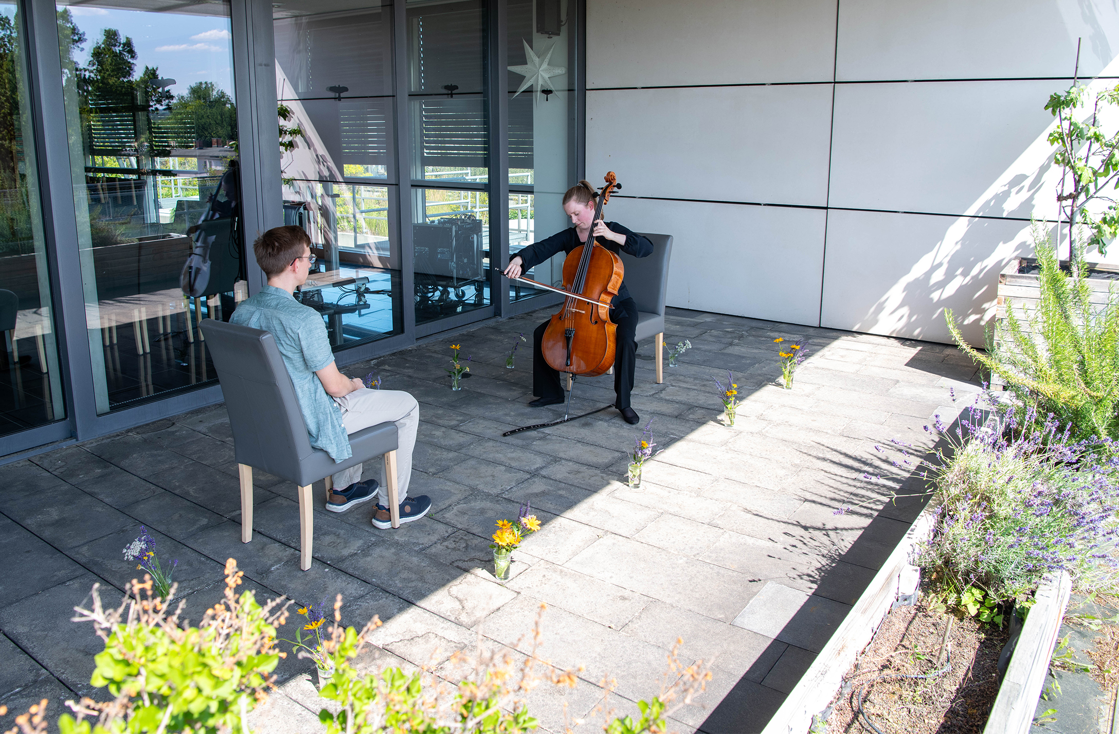 Die Dachterrasse mit herrlichem Blick über Potsdam verwandelten Alma-Sophie Starke, Violoncello und Flötistin Bettina Lange. Die Klänge von Debussys Syrinx oder Bachs Cellosuite schwebten herrlich über den Dächern in der Nachbarschaft und ließen weitere Gäste heimlich teilhaben.