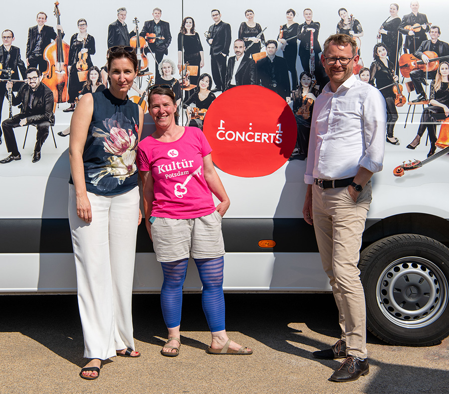 Franziska Ritter (1:1 CONCERTS e.V), Kristin Geschwäntner (Kultür) und Alexander Hollensteiner (Kammerakademie Potsdam) freuen sich über die zahlreichen Spenden der 1:1 Hörer:innen