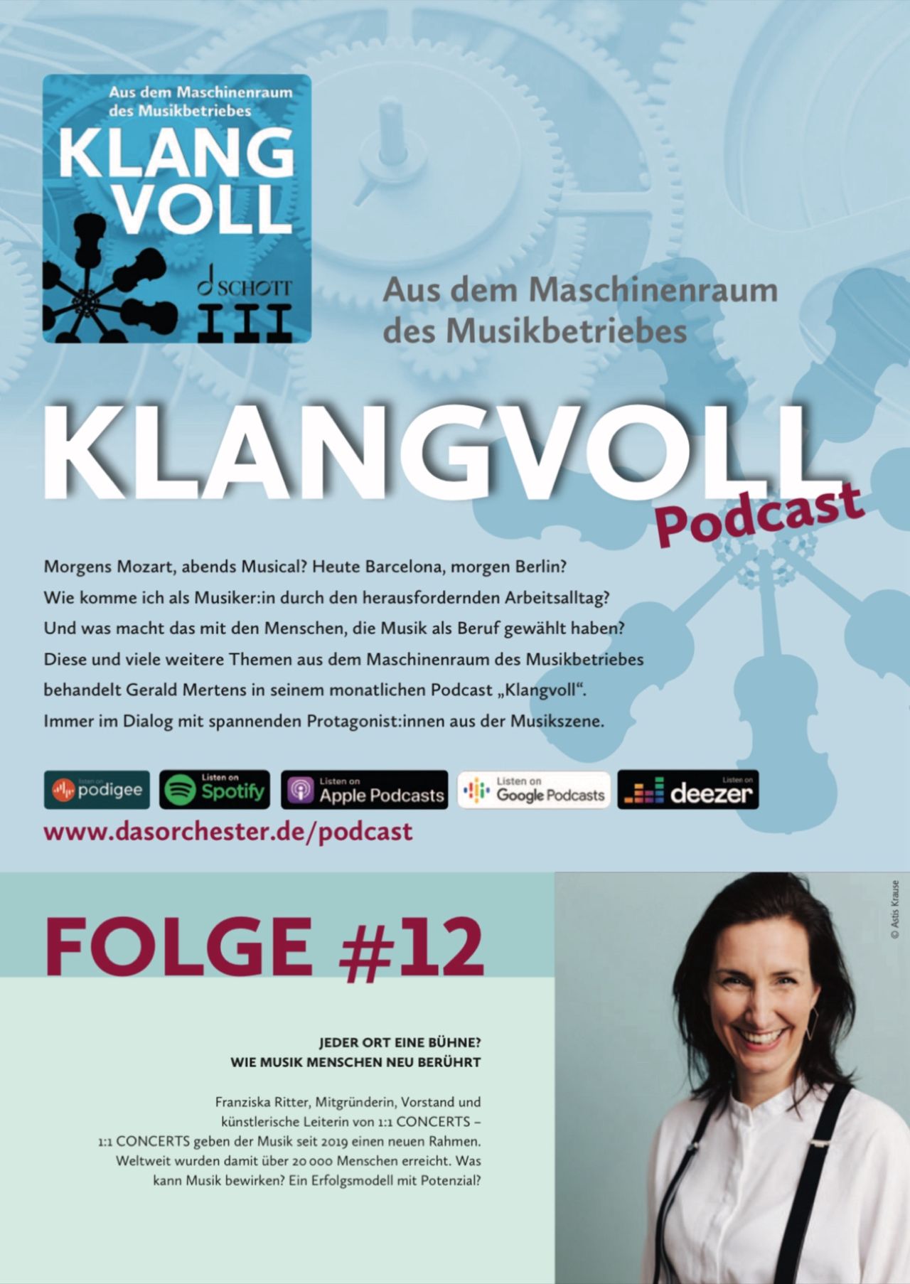 Franziska Ritter - eine unserer Mitgründerinnen, Vorstand und künstlerische Leiterin - ist zu Gast im Klangvoll Podcast von Schott Music und spricht mit Gerald Mertens über unser Format: "Jeder Ort eine Bühne? Wie Musik Menschen neu berührt"! 1:1 CONCERTS geben der Musik seit 2019 einen neuen Rahmen. Weltweit wurden damit über 20.000 Menschen erreicht. Was kann Musik bewirken? Ein Erfolgsmodell mit Potenzial? Hört gern rein!