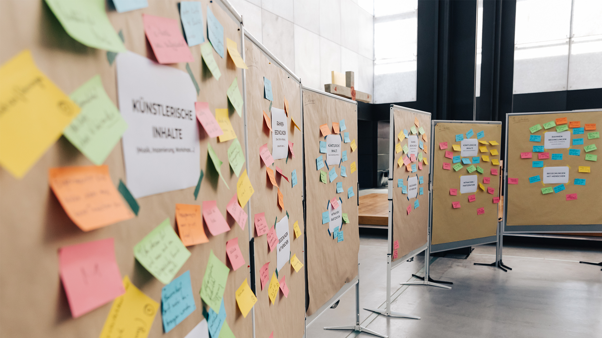 Die Denkwerkstätten waren mehrstufig aufgebaut. Bereits am Freitagabend reflektierten wir im Kernteam die Erkenntnisse unserer letzten Festival-Jahre. Was ist Dir in Erinnerung geblieben? Was bewegt dich beim Festival, was motiviert dich? Was darf gehen (Inhalt, Verhaltensweisen, ...)? Wovon willst du in Zukunft mehr erleben? Basierend auf dieser Einstimmung bildeten wir das Team zu “Resonanz-Sammler:innen” für die dialogischen Publikumsinteraktionen am zweiten Festivaltag aus. Hierfür destillierten wir gemeinsam eine Reihe an Themen, in denen die Sammler:innen mit dem Publikum auf die Suche nach Resonanzen gehen sollten.