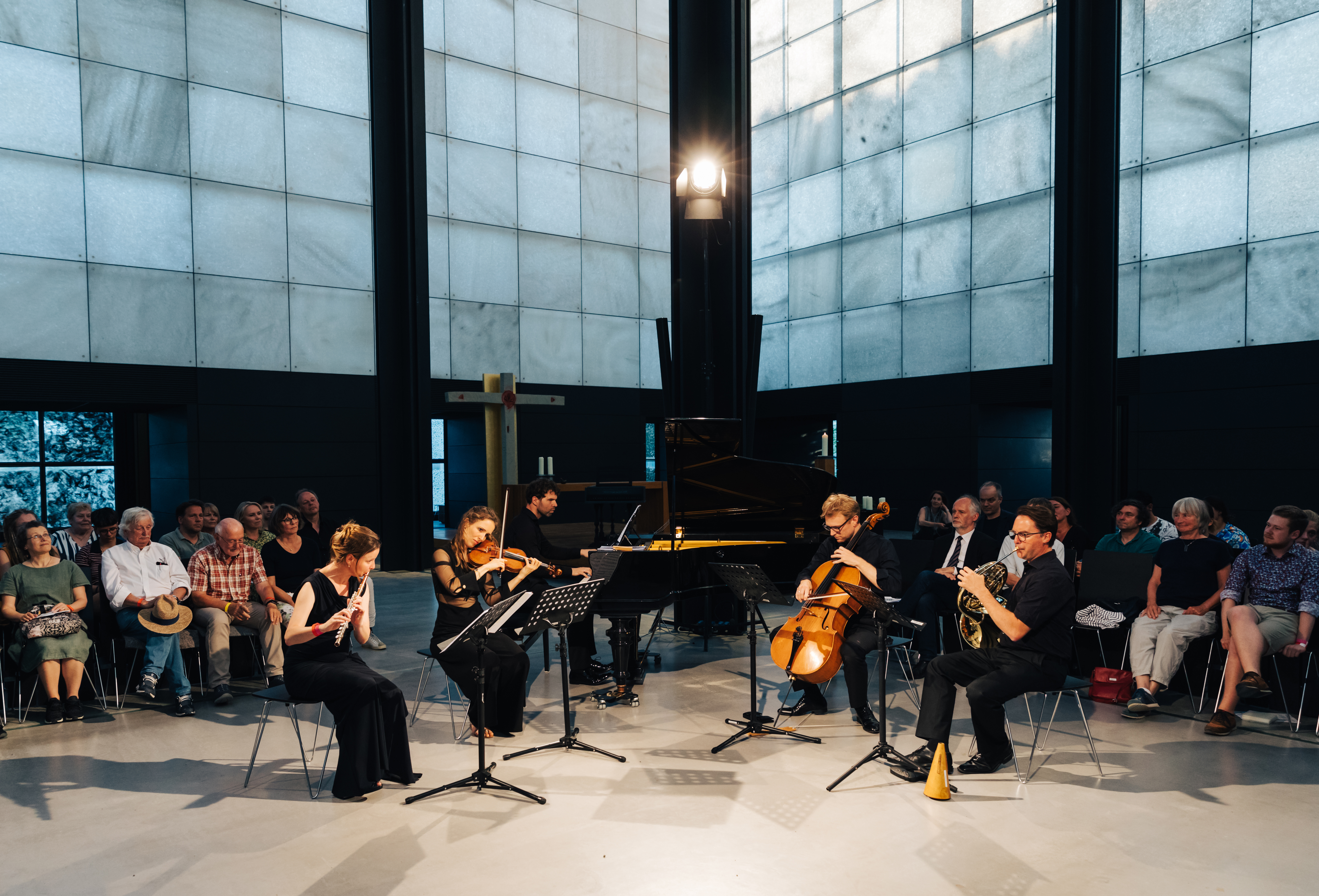 Am Samstagabend verwoben wir in dem Konzert „Werk-statt-Denken” die Eindrücke des Tages zu einem Kammerkonzert im Christus-Pavillon mit weiteren Werken wie Johann Sebastian Bachs Musikalisches Opfer oder Peteris Vasks (*1946): „Das Buch“ für Violoncello solo, Joseph Holbrooke Horntrio Nr 1 op 28 und Eric Ewazen (*1954)Trio für Flöte, Horn und Klavier.