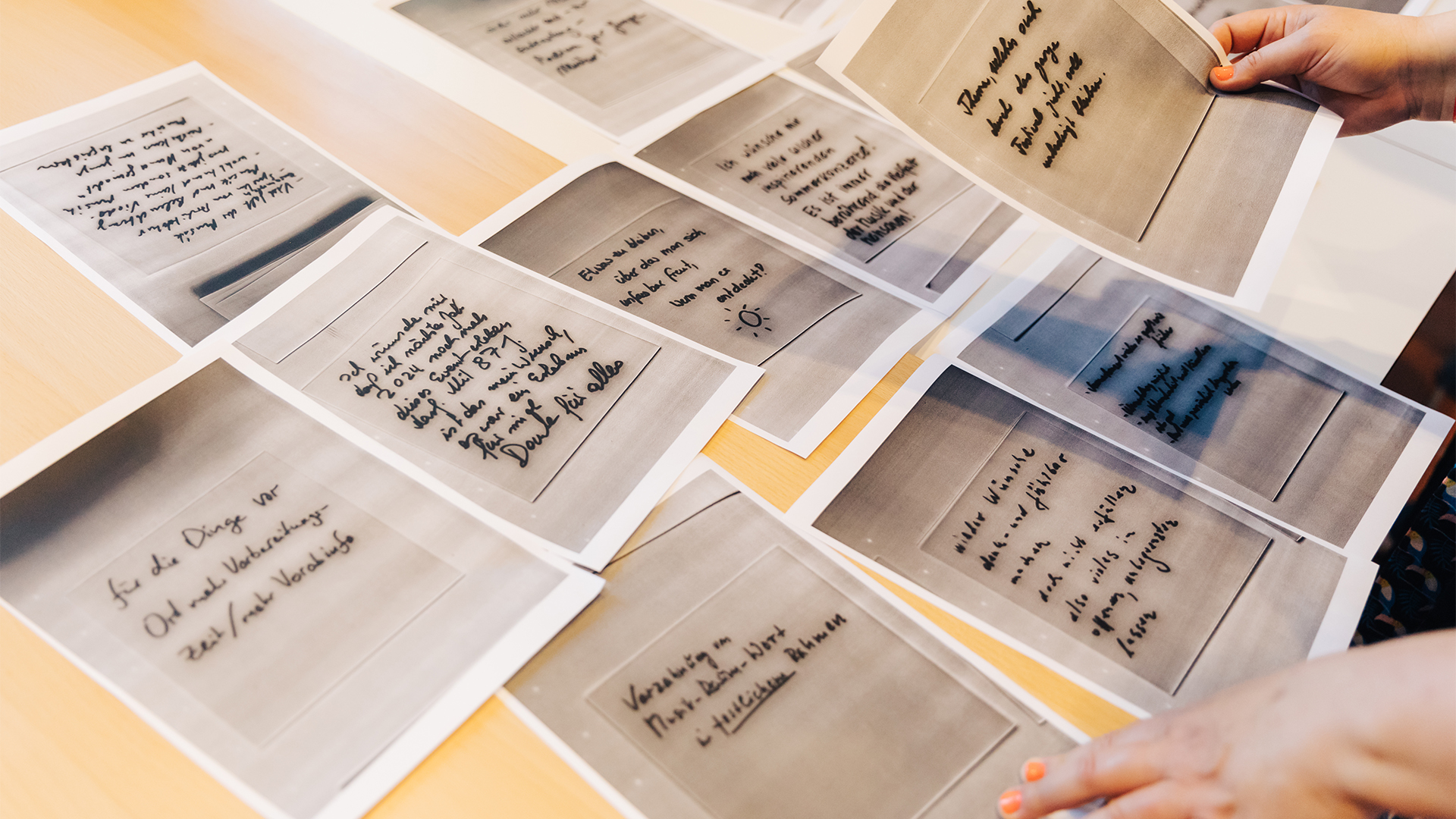 Am Samstagnachmittag eröffneten wir im Christus-Pavillon die Publikumswerkstatt. Zur Musik von Peter Schickele luden wir fünf kuratierte Gruppen zu einstündigen Gesprächskreisen ein, die von jeweils zwei Resonanz-Sammler:innen aus dem Kernteam geführt wurden. Zum Ende des Workshops gaben die Sammler:innen stellvertretend für die Gruppen wechselseitig einen Einblick in die eingefangenen Eindrücke. Aus diesem vereinten Pool an Gedanken wählten sich alle Teilnehmenden die für sie wichtigsten Resonanzen aus und schrieben diese Gedanken auf transluzente Folienwände. Aufgerichtet ergaben sich daraus kleine, individuelle “Resonanzräume”: stellvertretende sehr persönliche Miniaturen, die formal einen verbindenden Bezug auf die Architektur des Christus-Pavillons nahmen.