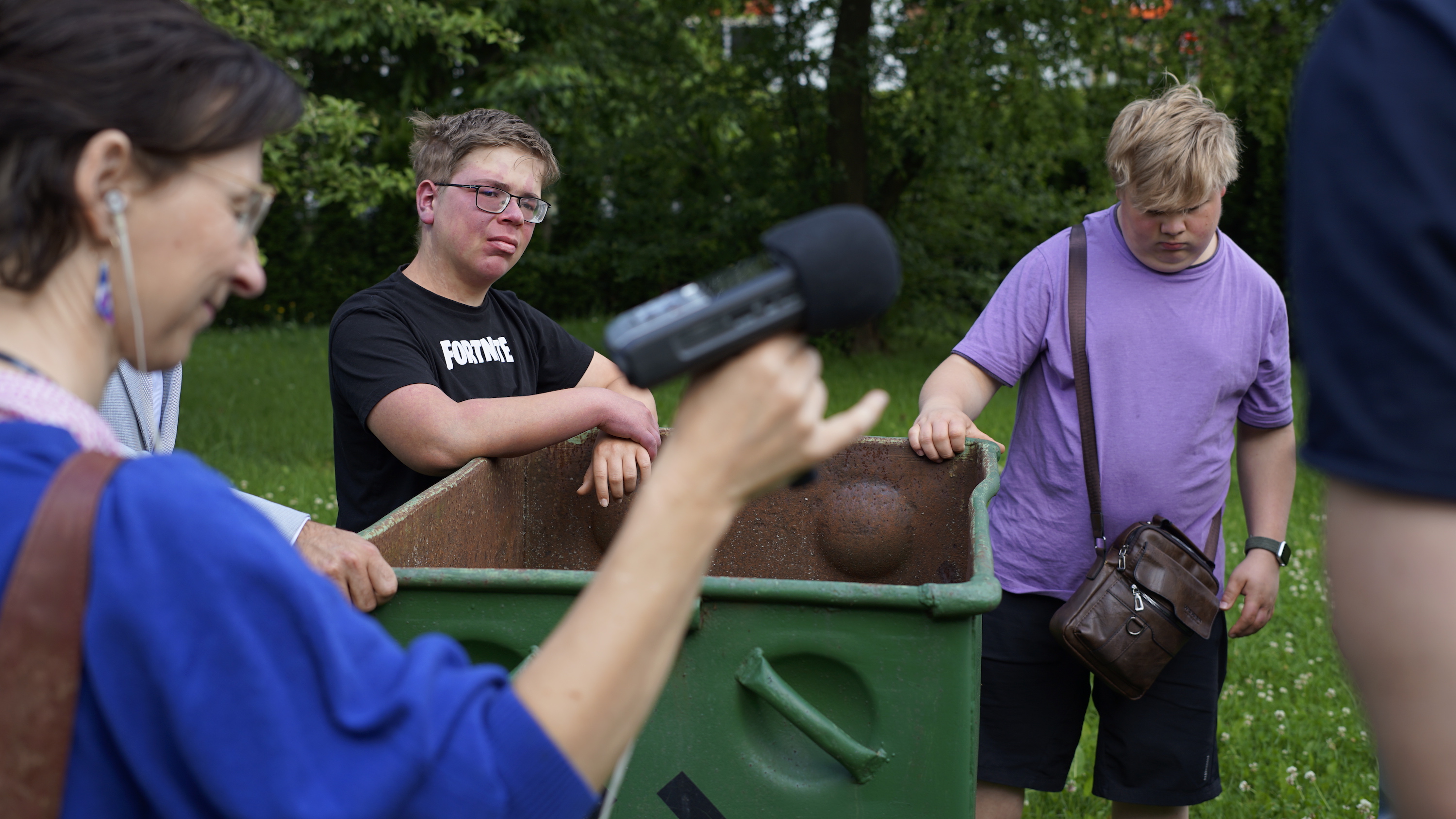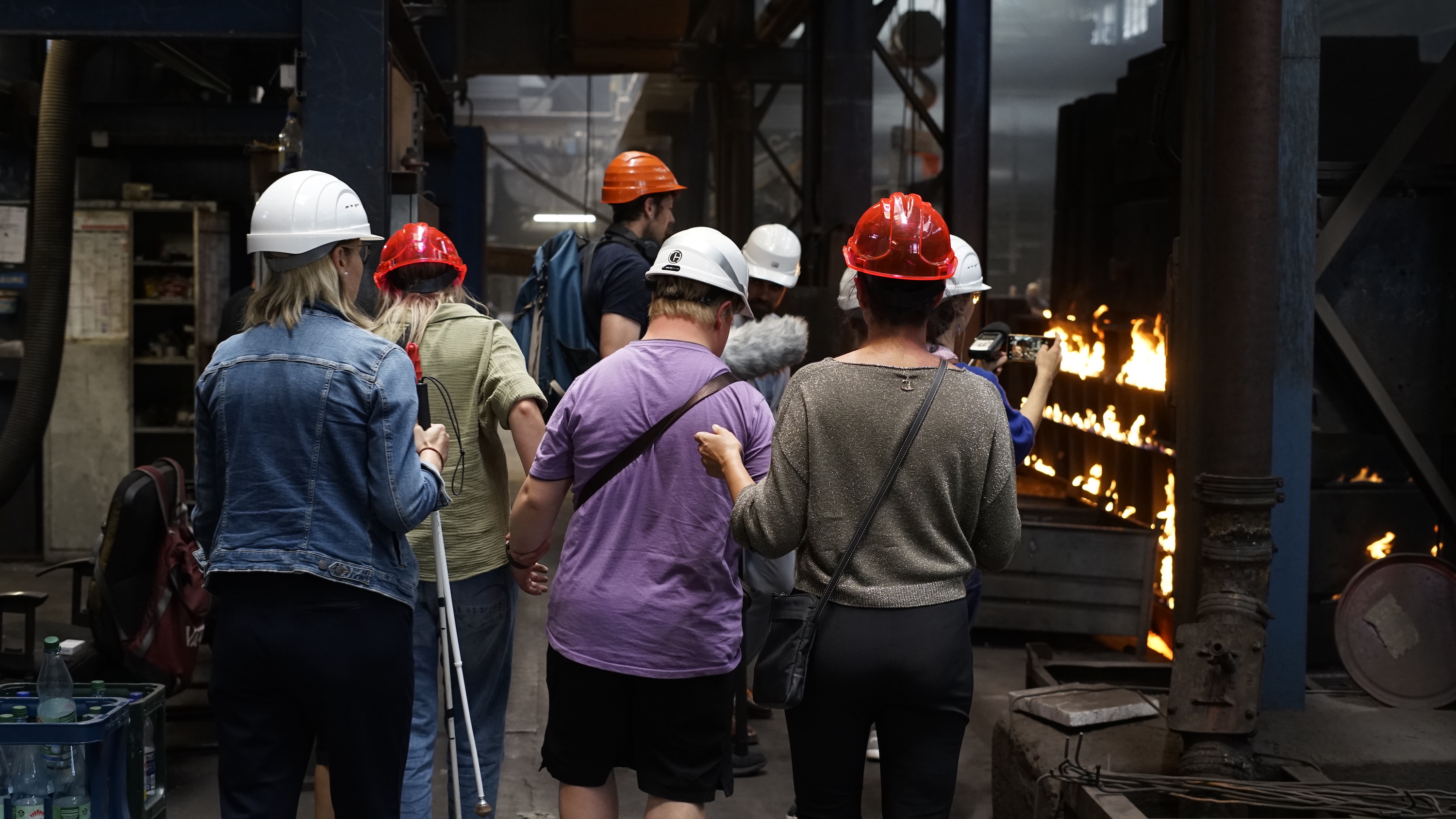 Ziel des Projekts war es, Vielfalt und Diversität als gesellschaftlichen Reichtum erfahrbar zu machen und Menschen aus unterschiedlichen Lebenswelten in einen kreativen Austausch zu bringen. Gerade die Begegnung zwischen Schüler*innen mit Sehbeeinträchtigung und Unternehmesmitarbeiter*innen stand im Mittelpunkt: Gemeinsam wurden unter Leitung des Soundkünstlers Jonas Urbat mit Aufnahmegeräten und Mikrofonen Klänge gesammelt, Perspektiven ausgetauscht und die Gießerei als Klangraum neu entdeckt. Jonas, der mit SoundWERK Productions spezialisiert ist auf das Hörbarmachen von Klängen in Industrieorten, beschreibt den Hörspaziergang als ein sehr besonderes Erlebnis:
