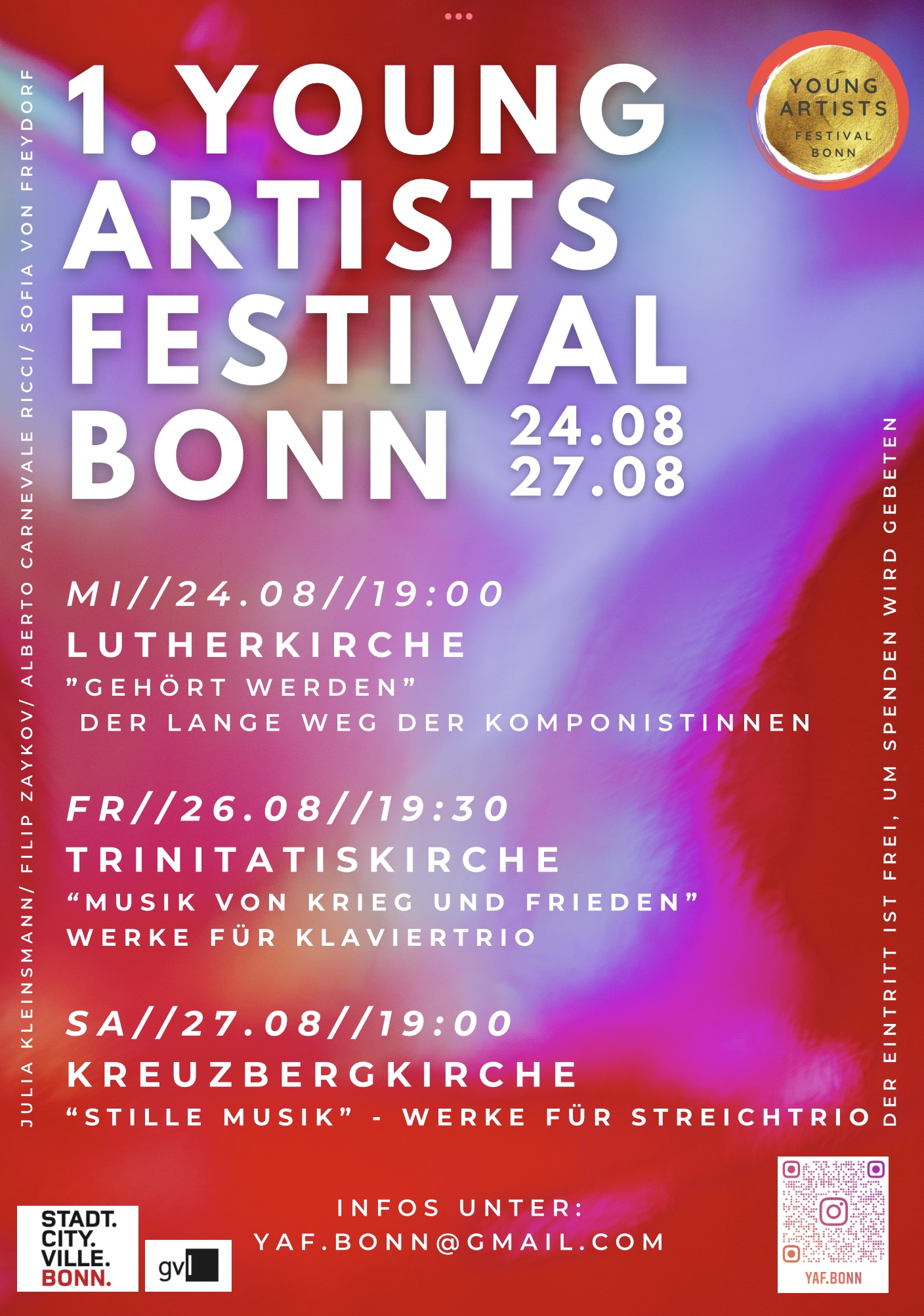 Das frisch gegründete Young Artists Festival Bonn rund um die Musikerin Sofia von Freydorf bringt Ende August junge Musiker:innen aus verschiedenen Ländern zusammen. Eine kuratierte Reihe von Kammermusikkonzerten führt das Publikum in drei wunderbare Kirchenräume: die Lutherkirche, die Trinitatiskirche und die Kreuzbergkriche. Die jungen Musiker:innen aus Tschechien, Italien und den Niederlanden widmen die Kammermusikkonzerte Themen wie "Gehört werden - der lange Weg der Komponistinnen", "Krieg und Frieden" sowie "Stille Musik".